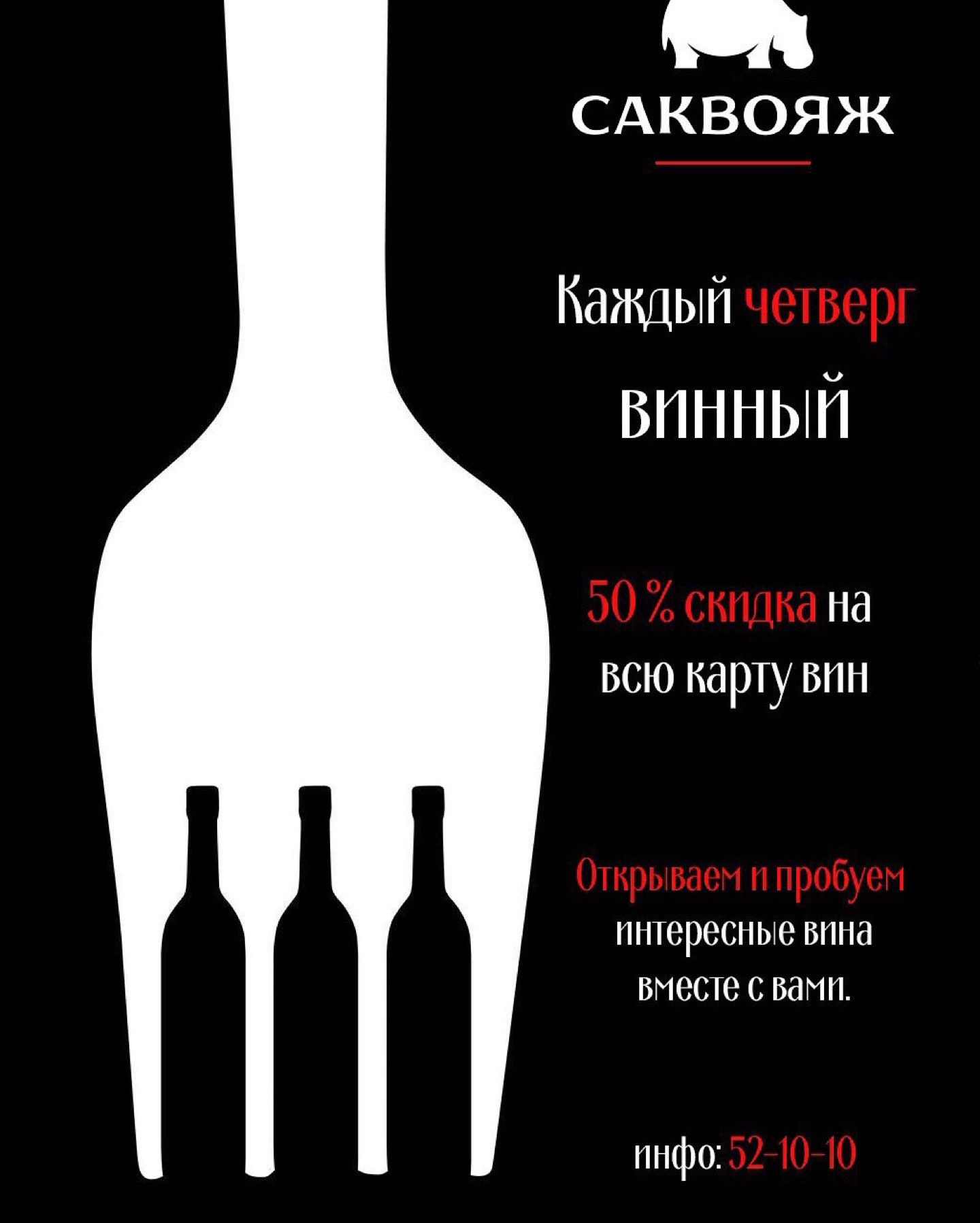 Четверг !!50% на всю винную карту. Воспользовалась !) спасибо ! Но ... Что за вонь с кухни ))?!пора поменять вытяжку ...!!!